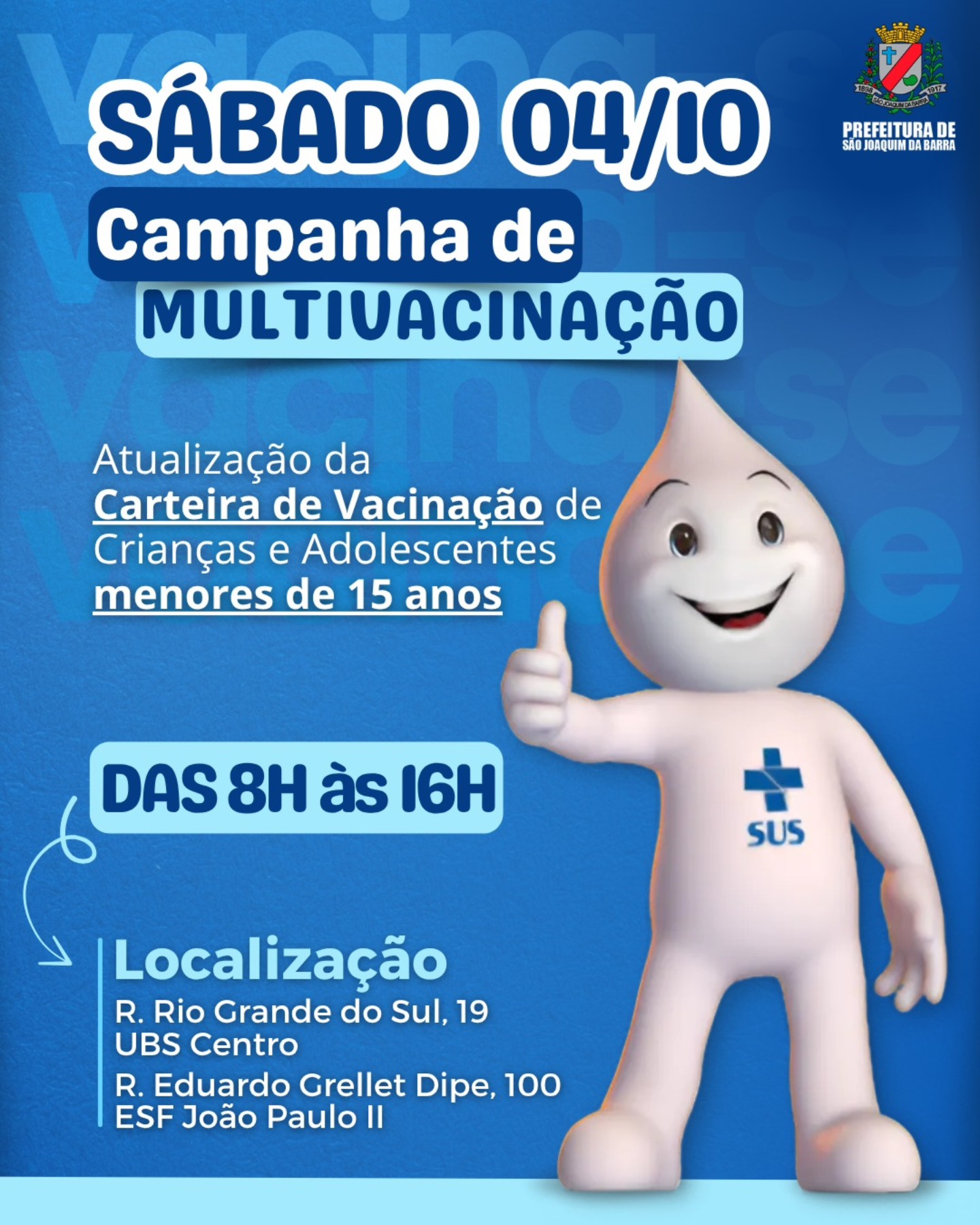 Foi montada uma estratégia de vacinação para atender esse público. As salas de vacina da ESF Central, na Rua Rio Grande do Sul, n.º 39, e do João Paulo II, na Rua Eduardo Grelet Dip, n.º 100, estarão abertas aos sábados, das 08h às 16h, durante todo mês de outubro, para atualização vacinal somente de crianças e adolescentes até 15 anos.