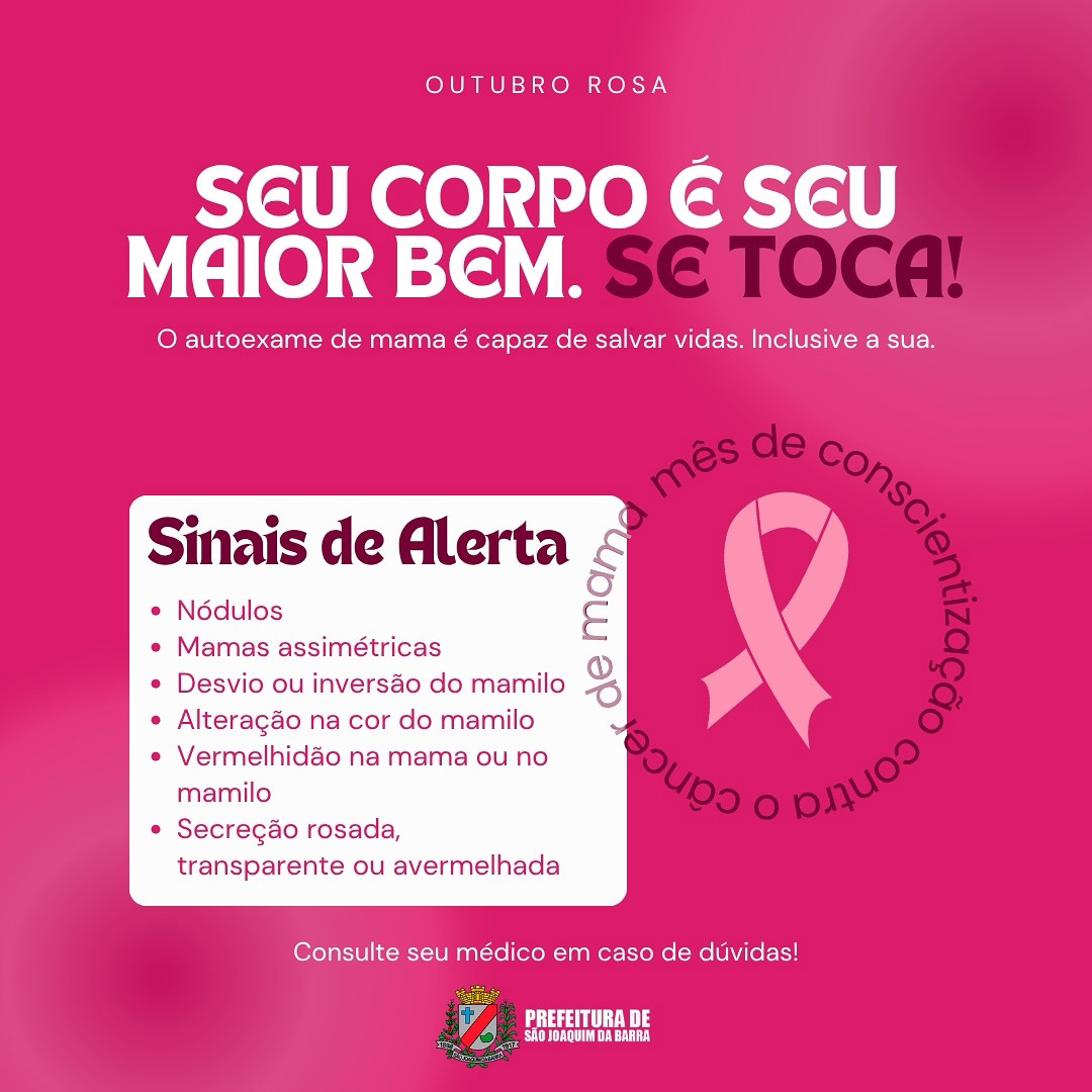 A Prefeitura reforça que seu corpo é seu maior bem e que cuidar da saúde é fundamental. O movimento Outubro Rosa é um chamado para que todas as mulheres estejam atentas aos sinais do próprio corpo e mantenham em dia os exames de rotina.