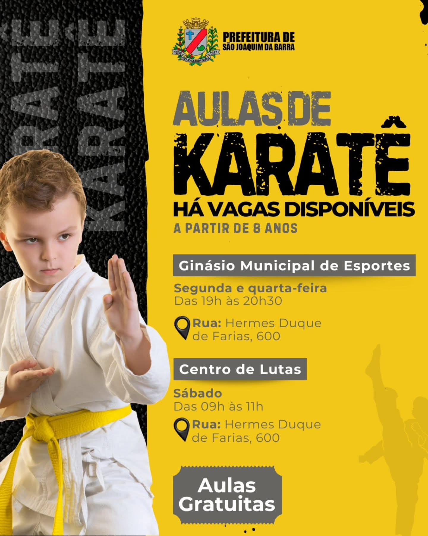 As aulas são realizadas de segunda a quarta, das 19h às 20h30, no Ginásio Municipal de Esportes e aos sábados, das 09h às 11h, no Centro de Lutas.