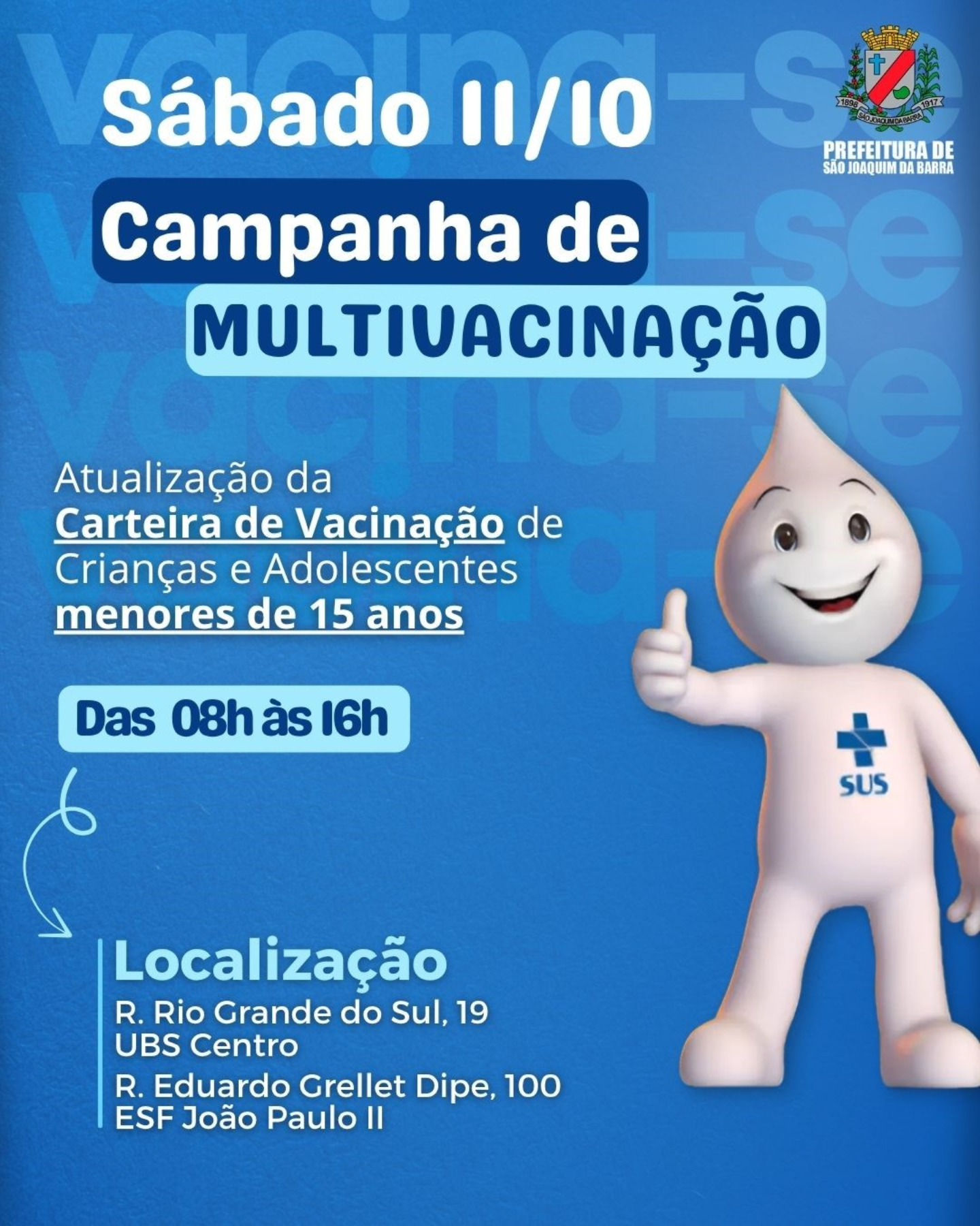 Lembrando que é necessário apresentar a carteira de vacinação, CPF e cartão SUS.