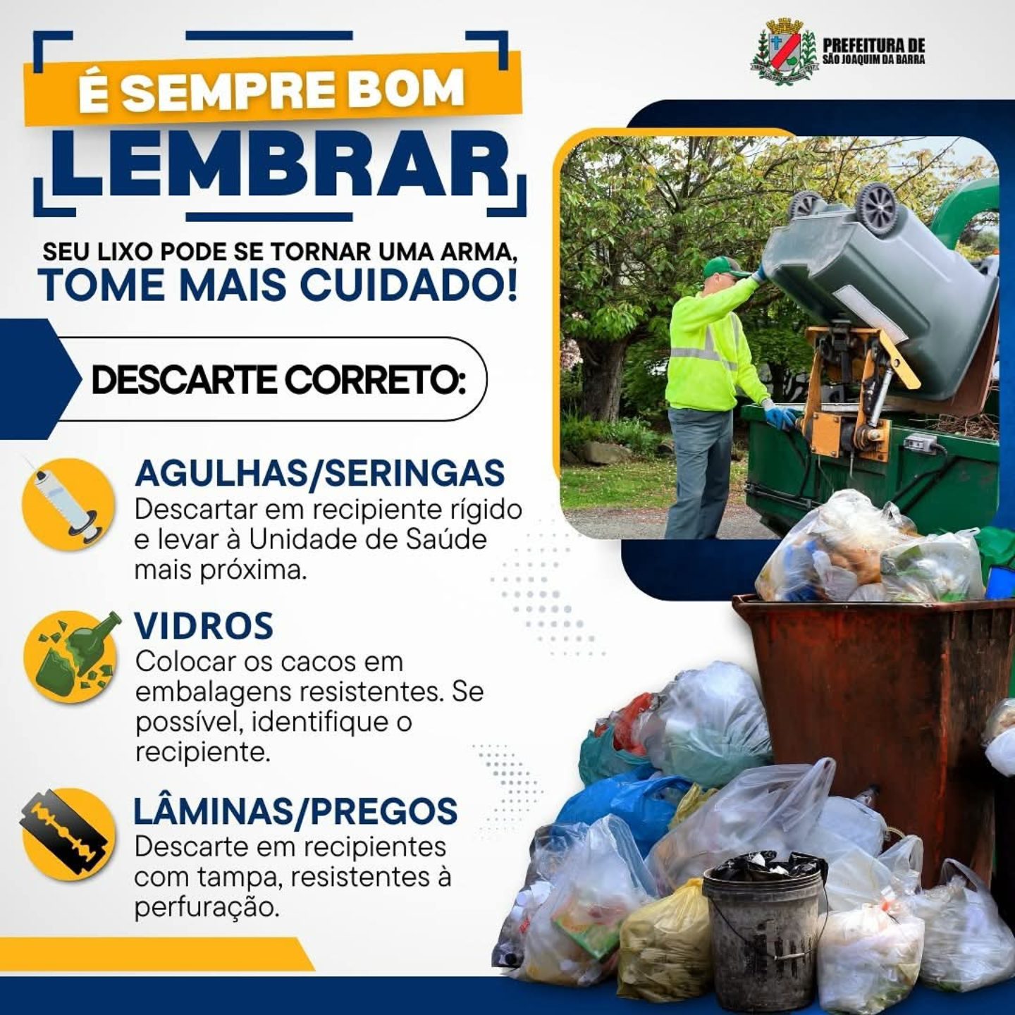 A Prefeitura de São Joaquim da Barra, por meio do Departamento de Agricultura de Meio Ambiente, reforça a importância de descartar resíduos de forma correta para proteger o meio ambiente e garantir a segurança dos coletores.