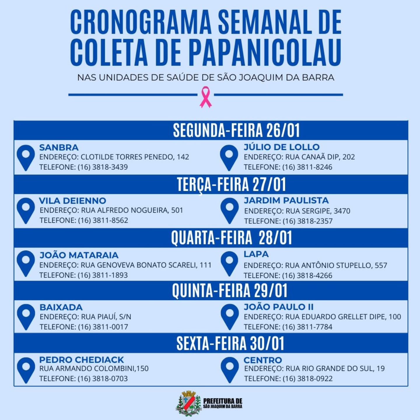 As ESF´s - Estratégias de Saúde da Família de São Joaquim da Barra continuarão com o horário estendido na próxima semana, das 17h às 20h, para a coleta do Papanicolau, exame essencial para a detecção precoce do Câncer de Colo do Útero. E o melhor: todos os exames serão analisados no Hospital de Amor de Barretos.