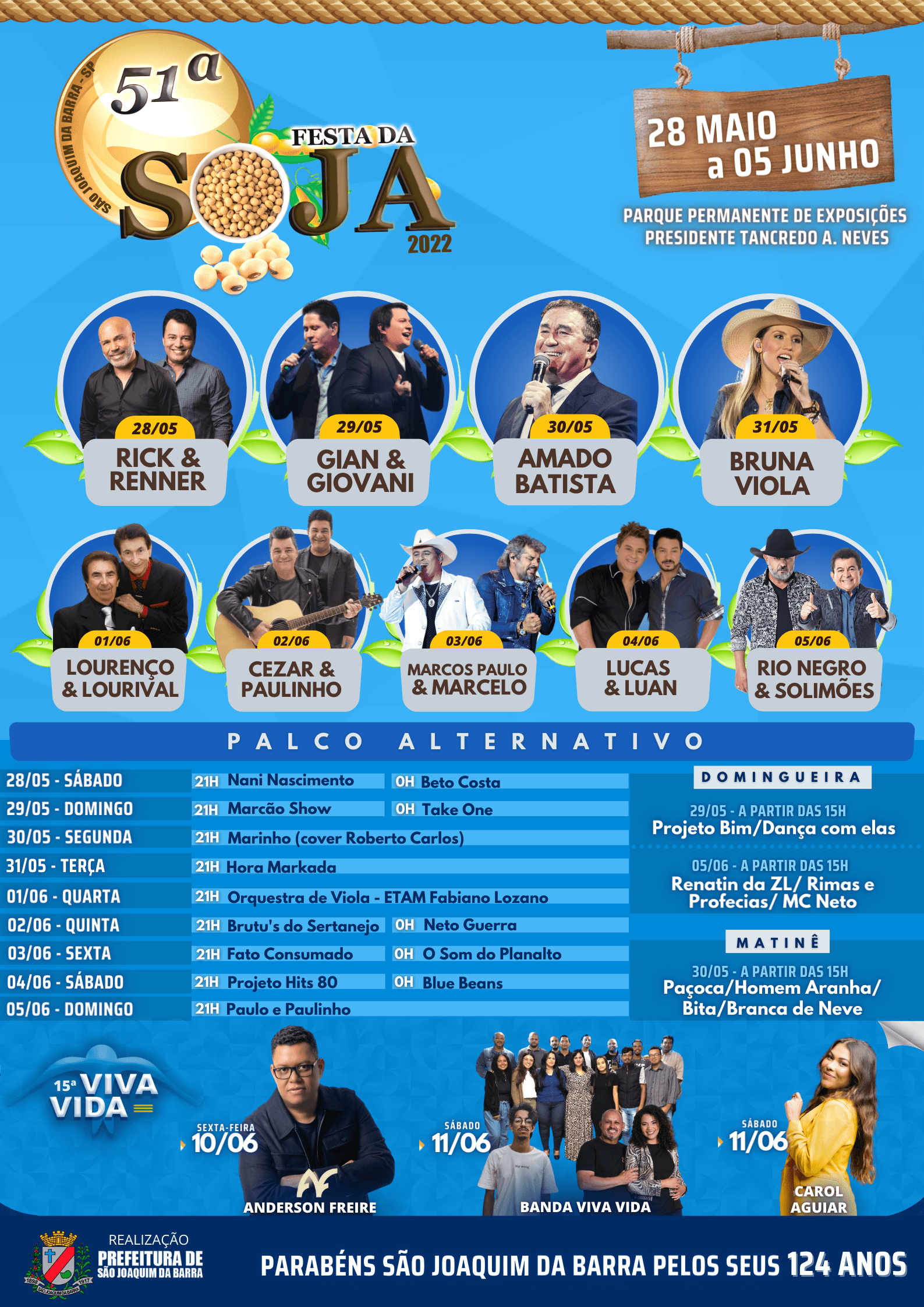 Veja abaixo a programação completa da 51ª Festa da Soja e 15ª Festa Cultural Viva a Vida: